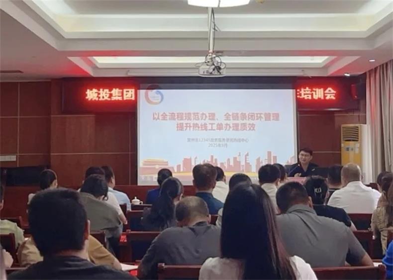 为切实提升12345热线工单办理质效,更好回应群众诉求,9 月 24 日,城投集团组织召开 12345 热线工单办理工作专题培训会。集团党委副书记、职工董事、工会主席陆剑如主持会议,市 12345 热线中心干部康作伟、话务班班长高时受邀授课并开展现场答疑,集团各子公司分管领导、部门负责人及工单承办人员共计30 余人参加培训。